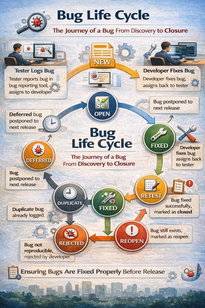 As the name suggests bug life cycle is the lifecycle of the bug which means it comprises of all the stages a bug will go through before getting closed.