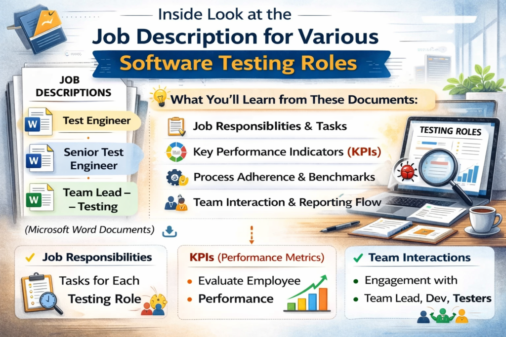 Attached below are three Microsoft word documents containing the job descriptions for various software testing roles that organizations use for their internal purposes. By going through these documents you will be able to understand not only the job responsibilities for various software testing roles but also the key performance indicators for each role. Key performance indicator or KPI is used by organizations to evaluate the employee’s performance.